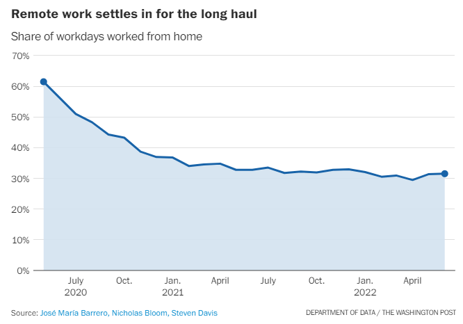 Other data points support this observation, and suggest that remote workers are switching to a hybrid schedule. A new poll shared with The Post by Gallup found 29 percent of remote-capable workers working from home full time in June — down from 39 percent in February — while the share working hybrid schedules rose a comparable amount. (Source: Washington Post)