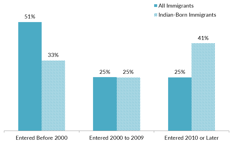 Bottomline - Indian immigrants have risen sharply in the last 20 years since the Y2K scare in 2000 via the H1B visa program. Typically Indians get roughly 74% of all the H1B visas every year (Source: "Indians bagged 3.01 lakh H-1B visas during fiscal 2021 – 74% of the total" / Times of India) This means that most of the Indian immigrants - roughly 41% - entered post-2010!