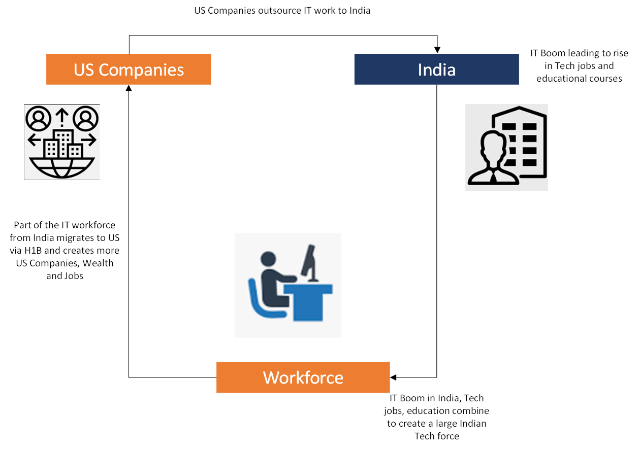 It is a complete circle. What started off as outsourcing of work for cheap created a big demand for IT workers in India. Indian ecosystem responded by creating courses, institutes, and colleges for technical education. This fueled the boom for IT work and jobs in India - creating the largest tech workforce pool in the world!