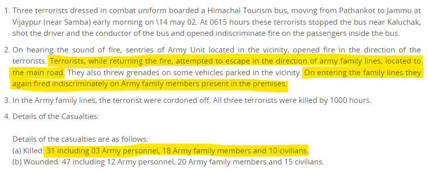 Back on May 14th, 2002, the Indian Army brigade had faced another similar attack just a little over 200 miles away in Kaluchak. Just far worse. 18 family members of the Indian army personnel had died in that attack. The dead included 10 children! (Source: NYT)