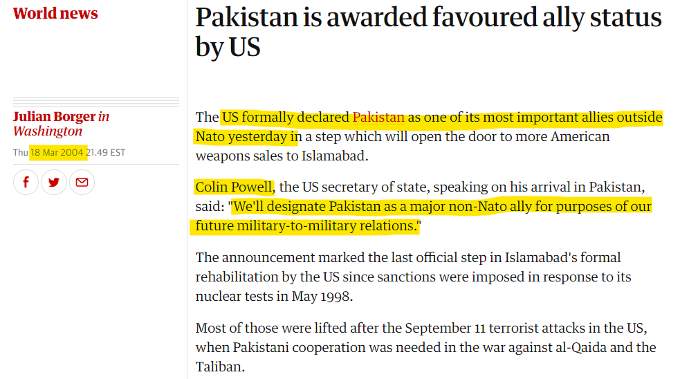 In 2004, when the US needed a presence in Afghanistan, Colin Powell, the then US Secretary of State, had declared Pakistan as a major non-NATO ally.