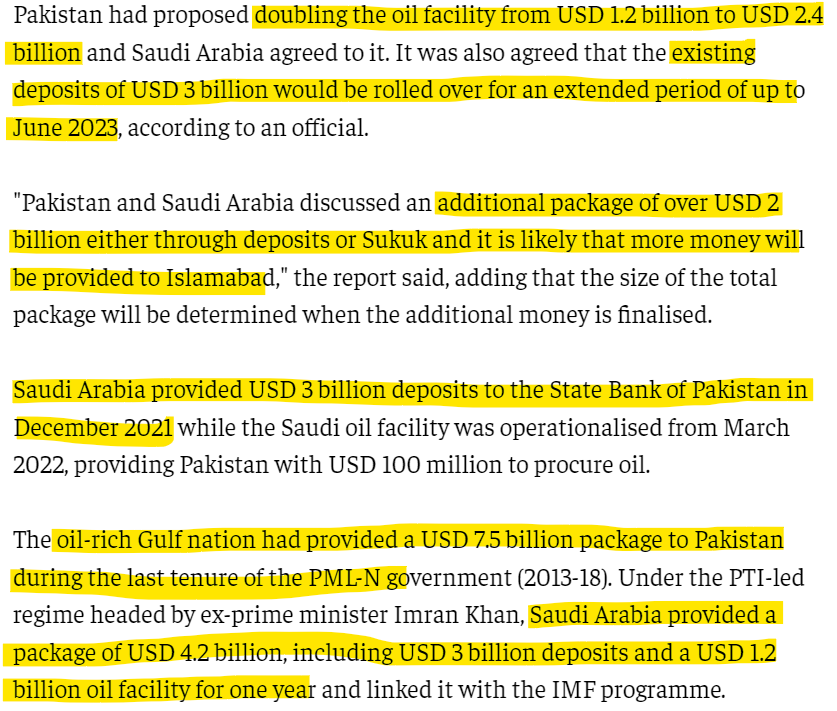 With foreign exchange reserves with the Central Bank at $8 billion and another $5.7 billion with commercial banks, Pakistan barely has enough to cover a month's worth of imports. And out of these $8 billion with the Central Bank, $3 billion are from Saudi Arabia just for parking these funds to stabilize the Pakistani rupee. These $3 billion cannot be used for repayment.