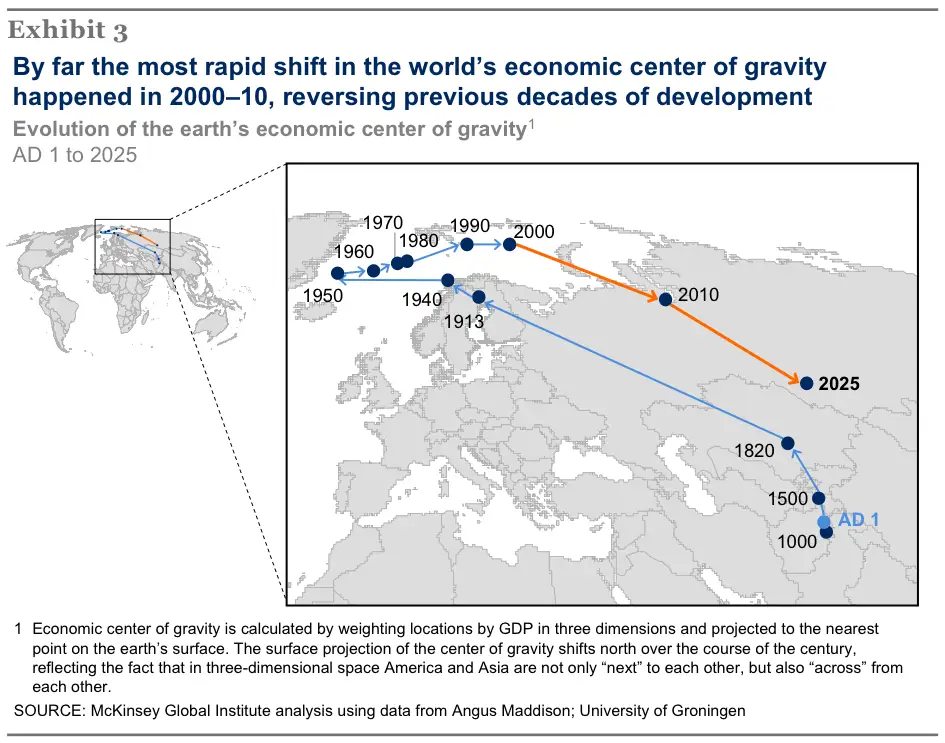 The Economic Center of Gravity as McKinsey called it in its article "Urban world: Cities and the rise of the consuming class," is shifting.