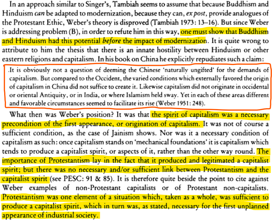 Weber's contention was that Buddhism and Hinduism did not provide the conditions necessary for Capitalism to take shape. Once it was introduced then there could be handled by that society.
