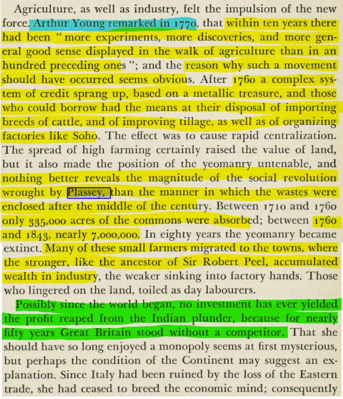 He even quoted Arthur Young, an influential English agriculturist of that era. Young remarks how the plunder from Plassey impacted not just the industrial revolution, as Adams brought out, but even revolutionized British agriculture.