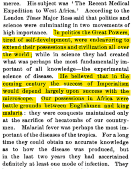 For example, Ronald Ross, Nobel Laureate for his work on Malaria, was not propelled by the good he would do for the poor people of the tropical land that were the hapless victims of Malaria - but by the service of imperialism. Scientific work, Ross believed, was going to be critical for the success of Imperialism.