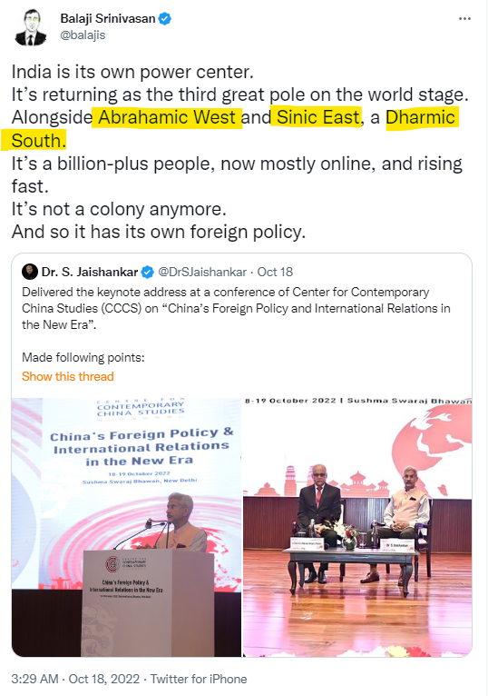 Abrahamic West and Sinic East, a Dharmic South.
