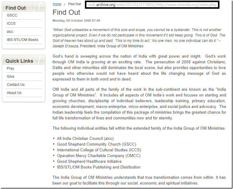 He is the Secretary-General of the All India Christian Council and a past president of the All India Catholic Union. You see, his All India Christian Council is involved in evangelical activities in India to alter the demography and the polity. As per the Operation Mobilization Ministries, many Christian organizations within India were part of its “family”. The page of which we have the snapshot below from Archive.org, has since been taken off the web.