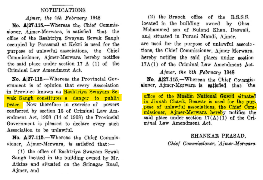 On February 4th, 1948, the Chief Commissioner of Ajmer, Rajasthan again banned both - the Muslim National Guards and the RSS.