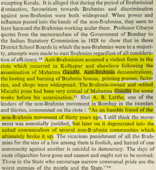 After the assassination of Mahatma Gandhi by Nathuram Godse, a Chitpavan Brahmin, Marathi Brahmins were targeted by kunbi- Maratha community led by Congress party leadership.