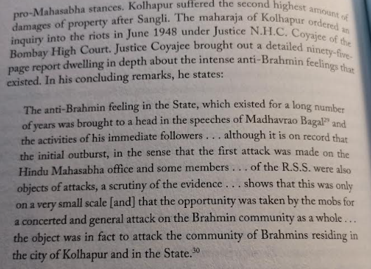 Justice Coyajee Commission which inquired into the Post Gandhi Assassination violence in June 1948 on the order of Maharaja of Kolhapur gave a 95-page report. That too focused heavily on anti-Brahmin feelings and terms the whole situation as "scrutiny of evidence... shows that this was only on a very small scale.."