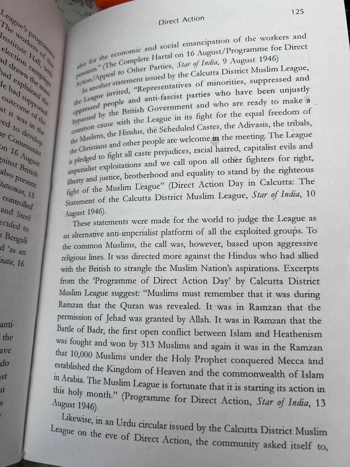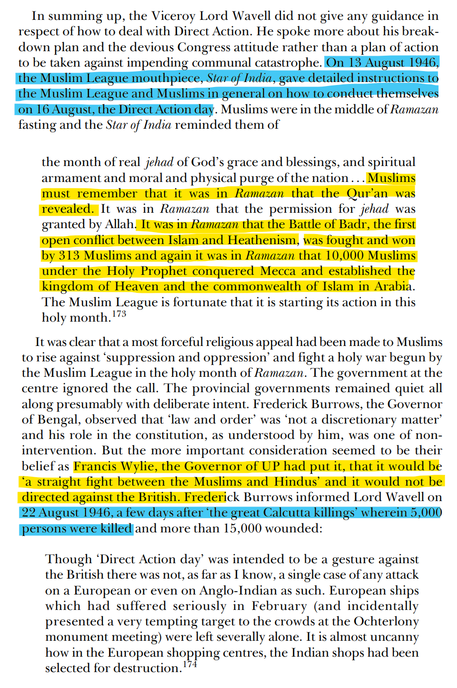 The call for Direct Action Day was very clear. It was a call for violence against the Hindus on the lines of the Battle of Badr. It was part of the advertisements and pamphlets that the Muslim League had distributed to its base and to Muslims all over India. As Francis Wylie said clearly - the situation was perceived to not be directed against the British but the Hindus.