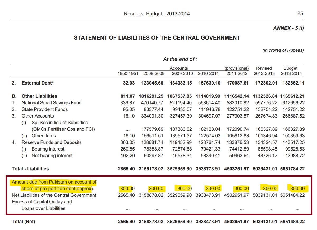 It shows the total liabilities at Rs 56,51,784.22 crore for 2013-14. From this, Rs 300 crore is deducted as ‘Amount due from Pakistan on account of share of pre-Partition debt (approx)’. It may be mentioned here that while introducing the Budget for 1948-49 on February 28, 1948, R.K. Shanmukham Chetty, the then Minister for Finance, had put the rate of interest at around three per cent for the Rs 300-crore debt. “Pakistan’s total debt is to be repaid in Indian rupees in fifty annual equated instalments for principal and interest. As a measure of assistance to the new Dominion in its earlier years it has been agreed that the first repayment should commence only in 1952,” he had said. Introducing the Budget for 1953-54 on February 27, 1953, C.D. Deshmukh, the then Finance Minister, said: “In the Budget credit had been taken for a recovery of Rs 9 crore from Pakistan as the first instalment of its debt repayment to India but as it has not yet been possible to reach an agreement on the provisional amount of the Partition debt, this payment is likely to be carried forward to the Budget year.” While presenting the Budget next year on February 27, 1954, Deshmukh said that he had taken credit for a recovery of Rs 18 crore from Pakistan on account of two instalments due from that country in repayment of the Partition debt. In the Budget presented on February 28, 1955, he said: “The credit of Rs 9 crore which I had taken in the Budget from repayment of Partition debt by Pakistan has, however, not materialised so far, as, contrary to the hope which I had expressed in my Budget Speech last year, it has not yet been possible, for a variety of reasons, to reach a settlement with Pakistan over the outstanding financial issues between the two countries.” (Source: "Pakistan owes Rs 300 cr to India since Partition" / Business Line)