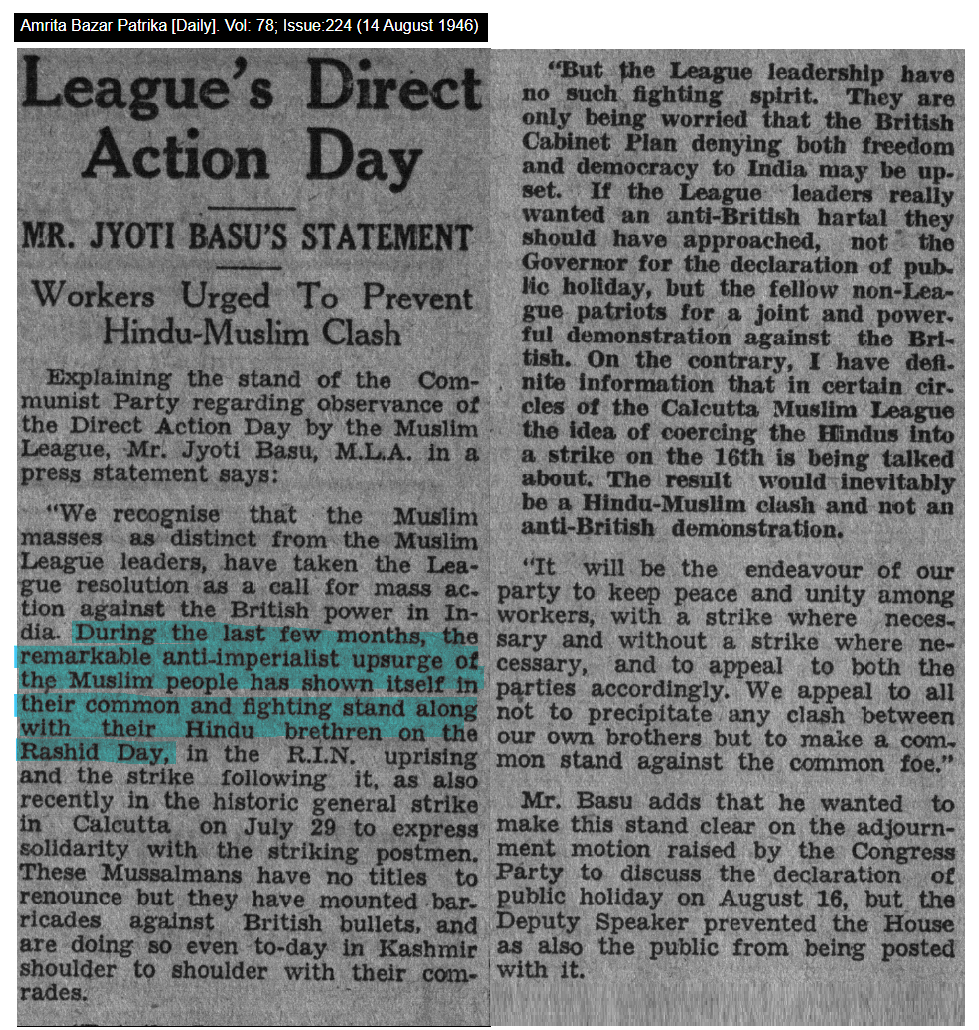 Jyoti Basu, who was to attend the Direct Action Day public meeting on August 16th with Suhrawardy released this statement on August 14th in Amrita Bazar Patrika.