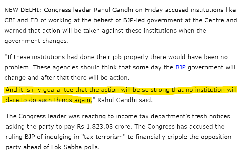 In a continuation of that same fascist and entitled tendencies, Rahul Gandhi warned the bureaucrats in the Enforcement Directorate and CBI who are working on cases against the Congress Party and the Gandhi-Nehru-Vadra family in particular of "strong action" when the Congress Party comes to power.