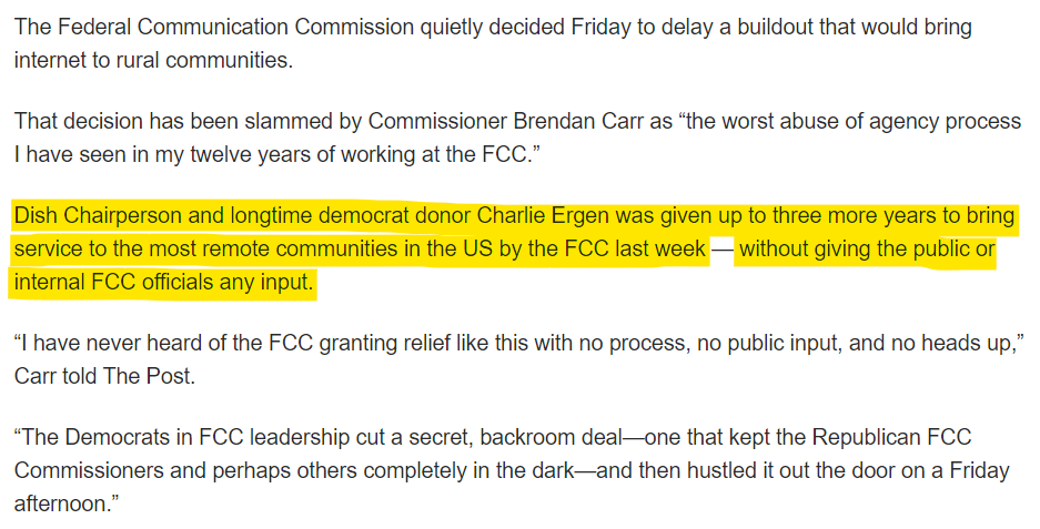 In the case of the rural internet rollout delay, attention has been drawn to the political contributions made by Charlie Ergen, the chairperson of Dish Network.