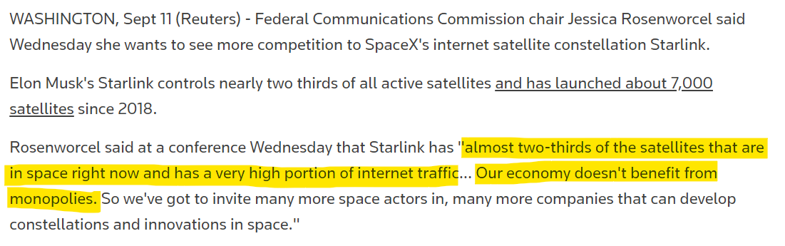Contrast how the internet access to rural areas has been effectively blocked and one subversive political operative handed the media monopoly to how FCC chair Jessica Rosenworcel was dinging Elon Musk and his Starlink.
