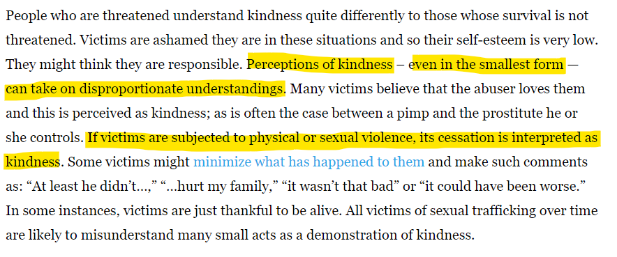The most damning element of Stockholm Syndrome is the perception of "kindness" by the victims. This acts as the building block and the glue to create and reinforce the abuse within the context of this syndrome.