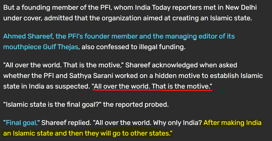 He also revealed how he raised funds for the PFI in the Middle East five years ago and sent them back home through hawala. "At that time, (Rs) 10 lakh or something," Shareef said. "Ten lakh? And how you sent it?" asked the reporter. "Hawala," answered Shareef. He admitted both the PFI and Sathya Sarani received funding through mainstream as well as illegal hawala channels. Source: "Operation Conversion Mafia: Kerala's conversion factories unmasked" / India Today