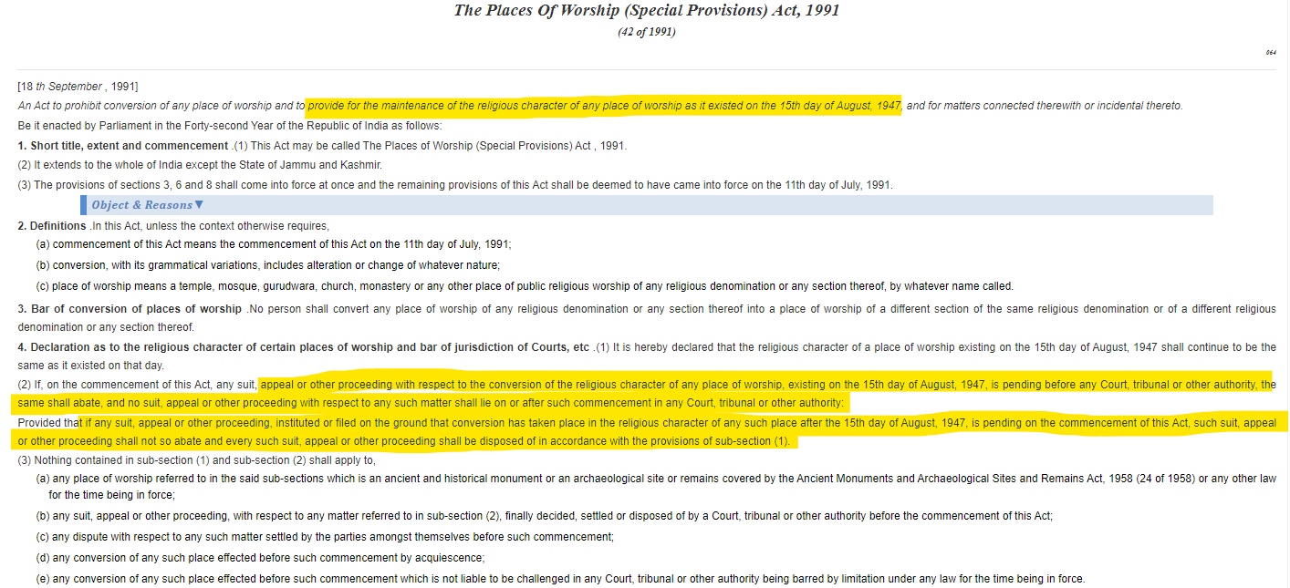 The Places of Worship (Special Provisions) Act, 1991 has been seen as a major hurdle to normalizing the conversion of Hindu temples from so-called mosques by the Islamic invaders to their original state in India. This is what it states.