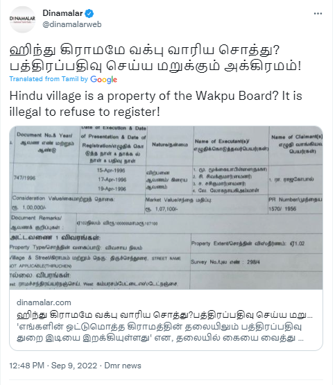 A shocking case of the Waqf Board encroaching on a property has come to light in Tamil Nadu, where an entire village with a Hindu majority population has been declared as waqf property. Thiruchenthurai village near Trichy, Tamil Nadu has been designated as a waqf property by the Tamil Nadu Waqf Board. Thiruchenthurai is a village situated on the south bank of the Cauvery river in Tamil Nadu. The issue was uncovered when a person named Rajagopal attempted to sell his 1 acre 2 cents of land to one Rajarajeshwari. When Rajagopal, a resident of the nearby village Mullikarupur village arrived at the Registrar’s office to get the sale of his land registered, he was surprised to learn that the land did not belong to him and instead belonged to the Waqf Board. (Source: "Tamil Nadu Waqf Board claims ownership of a Hindu-majority village, registrar asks villagers to obtain NOC from the board to sell their own land" Opindia)