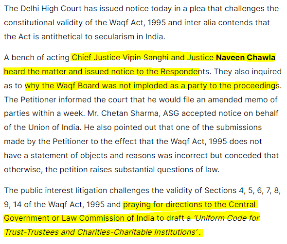 Delhi High Court on Thursday sought the stand of the Centre and Central Waqf Council on a public interest litigation seeking to declare that the Waqf Act is in violation of the Constitution and that private properties of citizens can only be governed by a uniform civil code (UCC). (Source: Times of India)