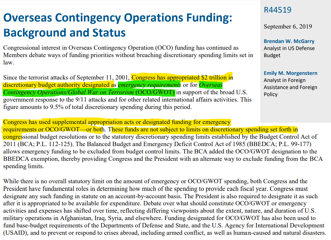 Most of the funds for the Afghanistan and Iraq wars were appropriated using the “emergency” and “contingency” funding that circumvented the normal budget process. The result was that the spending oversight was minimal and it was kept on with the pretense that the wars were "short term" and about to end.