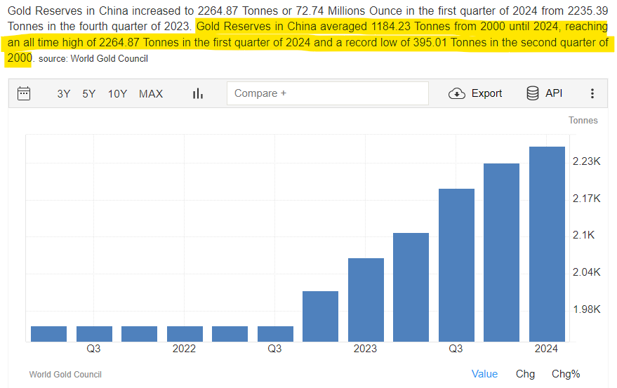 China significantly increased its gold reserves, adding 225 tonnes in 2023. By the first quarter of 2024, China's gold reserves had grown to 2,264.87 tonnes, up from 2,235.39 tonnes in the fourth quarter of 2023. This accumulation is part of China's broader strategy to reduce reliance on the US dollar and strengthen its currency's global standing.