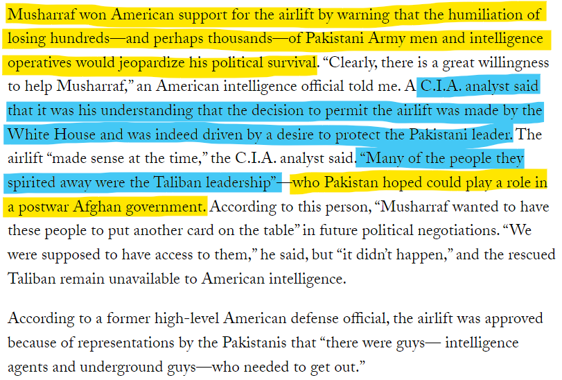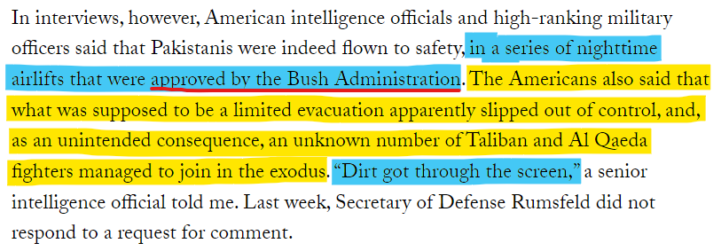 Great talk, right?! But the Bush administration was playing a double game. On the other side, they were working with the Pakistanis to allow the Pakistani Air Force to, apparently, evacuate their fighters fighting alongside Al-Qaeda and the Taliban in Afghanistan. Instead, thousands of Al Qaeda and Taliban terrorists made their way to Pakistan.