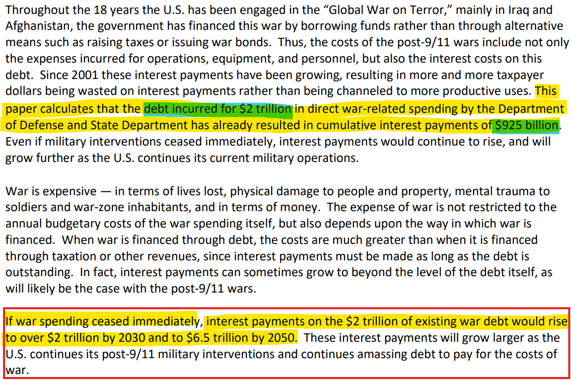 And the cumulative cost of war to the American taxpayers? Interest payments of $6.5 trillion by 2050!!