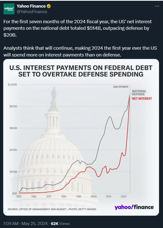 For the first seven months of the 2024 fiscal year, the US' net interest payments on the national debt totaled $514B, outpacing defense by $20B.