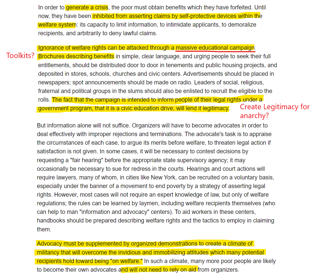 Richard Cloward and Frances Fox Piven wrote a seminal article in the liberal American magazine "The Nation". It was titled "The Weight of the Poor: A Strategy to End Poverty". Here is the pdf version of that article for your perusal.