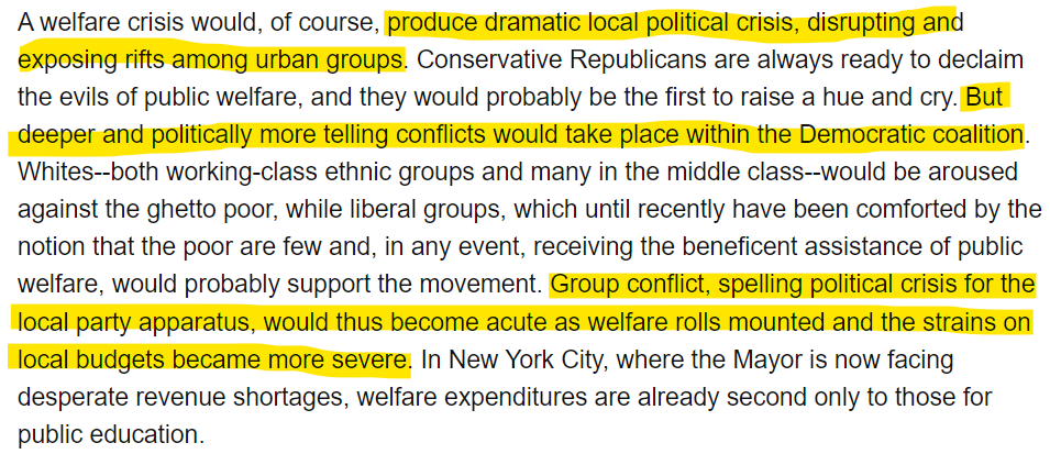 These disruptions would further "...deepen existing divisions among elements in the big-city Democratic coalition: the remaining white middle class, the working-class ethnic groups and the growing minority poor. To avoid a further weakening of that historic coalition, a national Democratic administration would be constrained to advance a federal solution to poverty that would override local welfare failures, local class and racial conflicts,override and local revenue dilemmas."