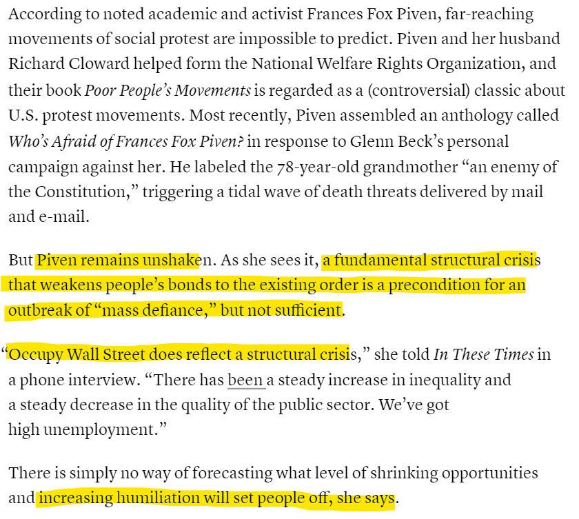 For Frances Piven Occupy was the structural crisis that was required for an outbreak of mass defiance.