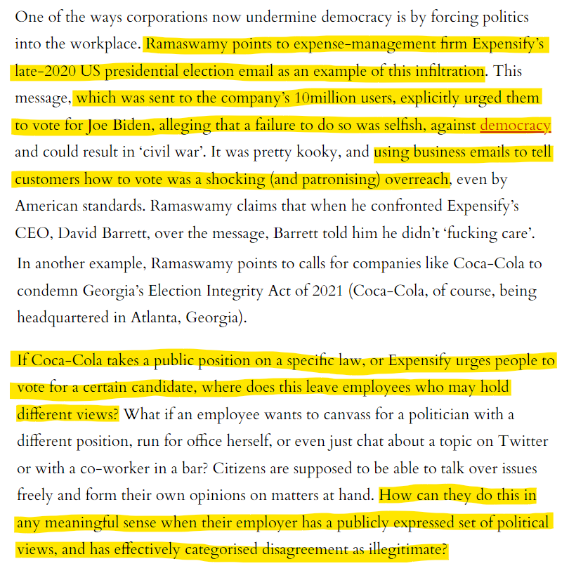 Companies - even top Fortune 50 ones - were pushing for political agendas and making it clear that their employees or customers should be voting in a certain way. Any different manner of political conduct was illegitimate in the eyes of the company's leadership.