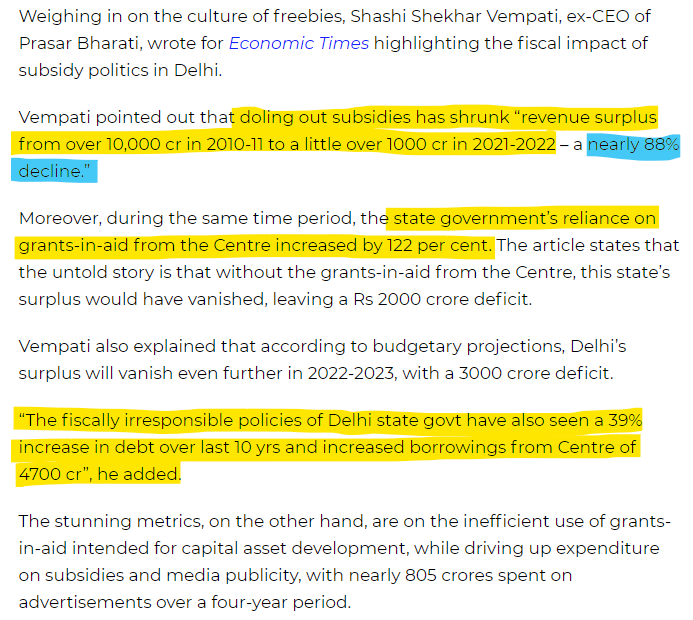 They had inherited a Delhi which had a surplus. The government gave away most of the money to the electorate in order to get political power while dismantling the local economy threadbare. The revenue surplus in the state fell 88% between 2010-11 and 2021-22 despite an increase in the Center's grants-in-aid of 122%!
