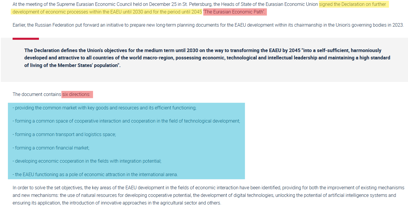 The declaration envisions two pivotal horizons: 2030 and 2045. By these milestones, the EAEU aims to evolve from a fledgling economic bloc into a robust macro-region, commanding respect on the global stage. There were 6 main directions for the future of EAEU.