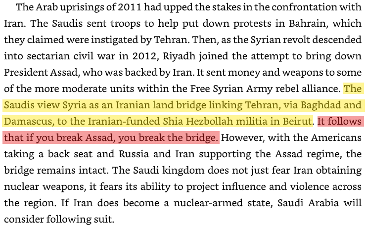 In his book, "The Power of Geography: Ten Maps that reveal the future of our world", Tim Marshall shares an interesting insight on the importance of Syria to Iran - and by extension to Israel, Saudis, and others. Saudis have viewed Damascus as the bridge from Iran to Beirut.
