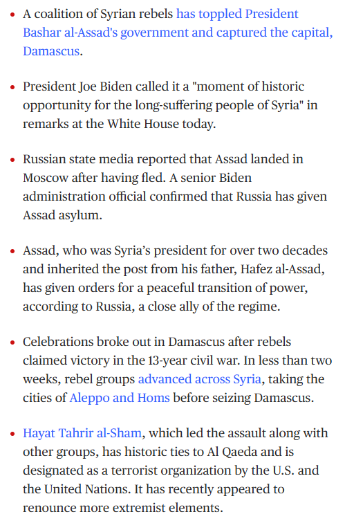 Israel says it has launched hundreds of airstrikes on Syria in the days since Bashar Assad's regime collapsed. On Tuesday, the Israel Defense Forces said it had "struck most of the strategic weapons stockpiles in Syria" in 48 hours as part of a push to stop the weapons "falling into the hands of terrorist elements." (Source: "Israel says it has carried out hundreds of strikes on Syria, targeting 'strategic weapons stockpiles'" / Business Insider)