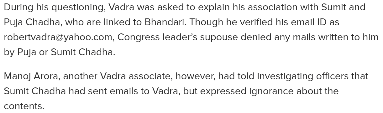And interestingly, it is not just Thampi that Vadra is lying about. He has also lied about his links to close associates of Sanjay Bhandari. These contradictions and lying can be very damning. Of course, in countries like US, it can lead to obstruction of justice and can even lead to the indictment of the US President!