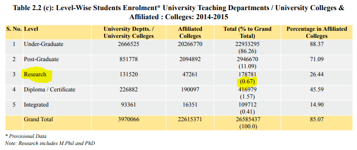 Across India, the number of research or M.Phil and Ph.D. students are less than 1% of the total students in the Universities.