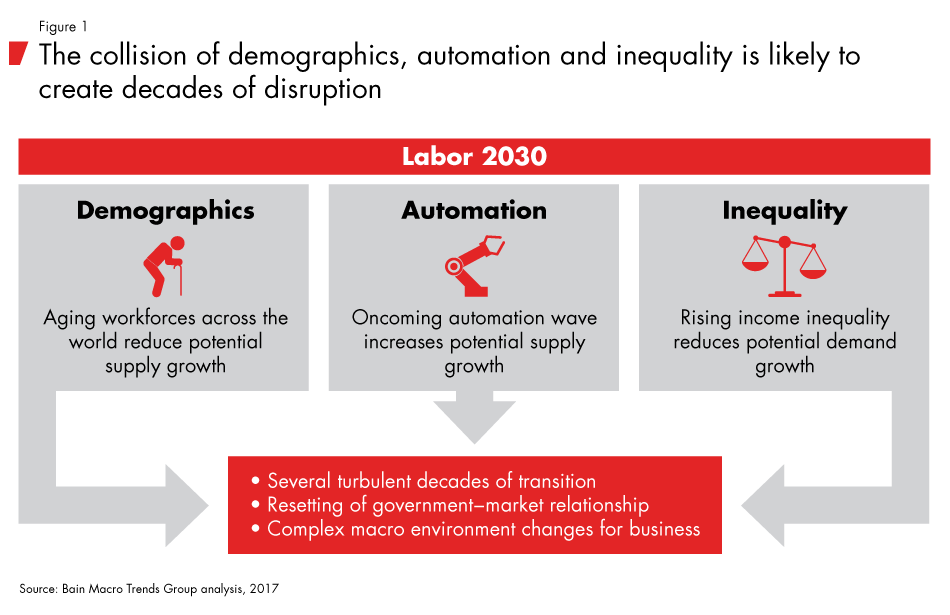 A study done by Bain & Co's Macro Trends Group looked at "how the impact of aging populations, the adoption of new automation technologies and rising inequality will likely combine to give rise to new business risks and opportunities."