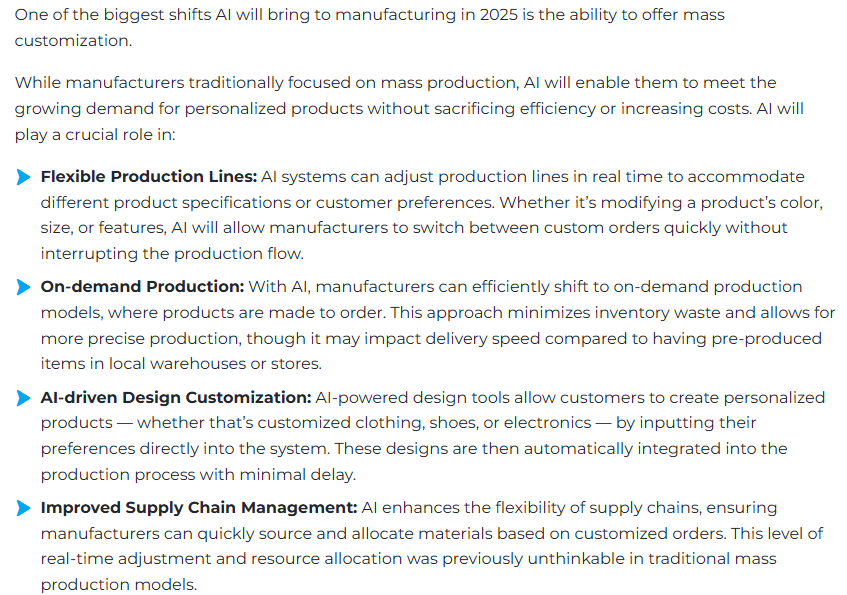 Once risky, just-in-time manufacturing is now supercharged by AI. Factories can produce exactly what’s needed, when it’s needed, enabling mass customization without massive inventory. Think Tesla’s agile model versus traditional auto giants.