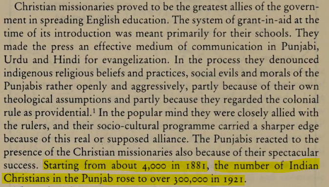 After the second Anglo-Sikh War victory, the British started aggressively using missionaries to convert Punjab. In a short span of time, the Christian population in Pujab grew from 4000 in 1881 to over 300,000 in 1921.