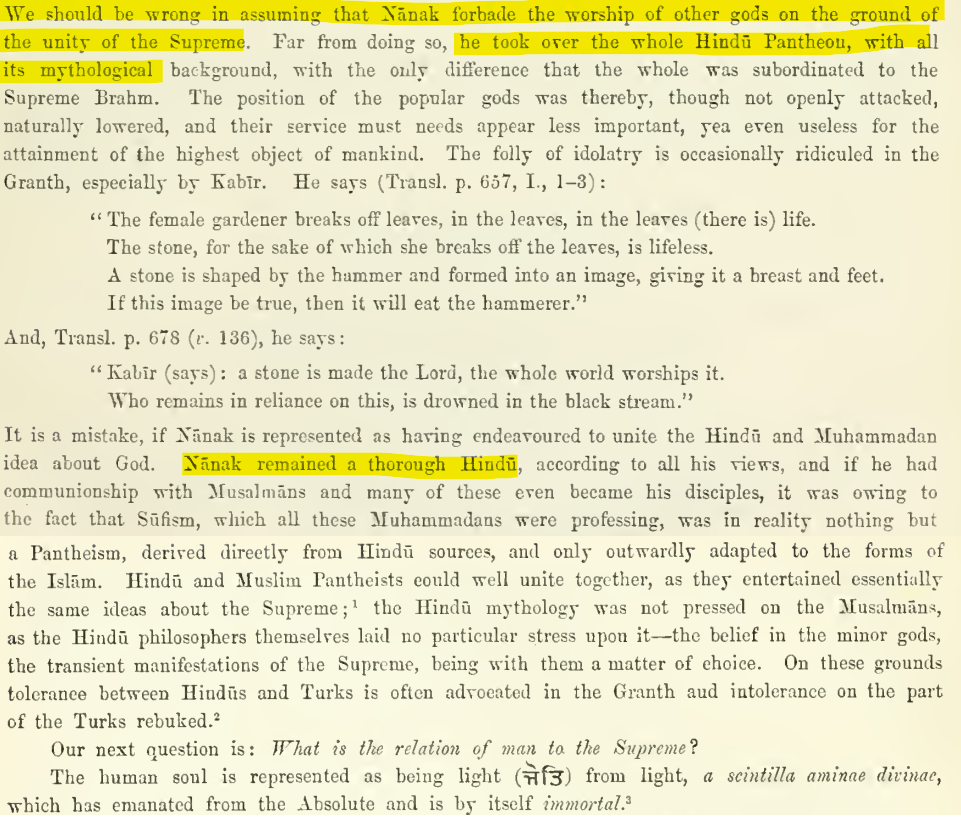 About Guru Nanak Dev, for example, Trumpp rejects the notion that Nanak was promoting an independent religious faith. He calls Nanak a "thorough Hindu".
