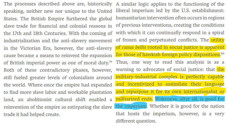 Within the naturally overwhelming isomorphism that runs through the American intelligence and establishment apparatus, an addition of Woke militarism does one thing important - any argument for dialog, discussion, or simply pushing for prudence becomes a target because it is branded as enabling oppression and injustice.