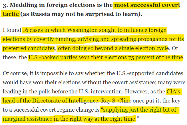 Between 1947 and 1989, the United States undertook a total of 72 regime change operations in other countries. 66 of these were covert and 6 overt. In 26 operations the US intelligence was able to change the government and a US-backed administration. In 40 operations it failed.