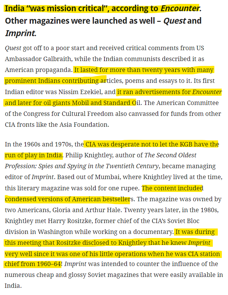 The KGB and CIA have played the different groups and players in India. Control over India was their biggest agenda. In fact, the former chief of the First Directorate of the KGB, General Oleg Kalugin, had once said that "India was for sale." Both the CIA and KGB had penetrated deep inside all branches of the government, politics, literature, media, and education.