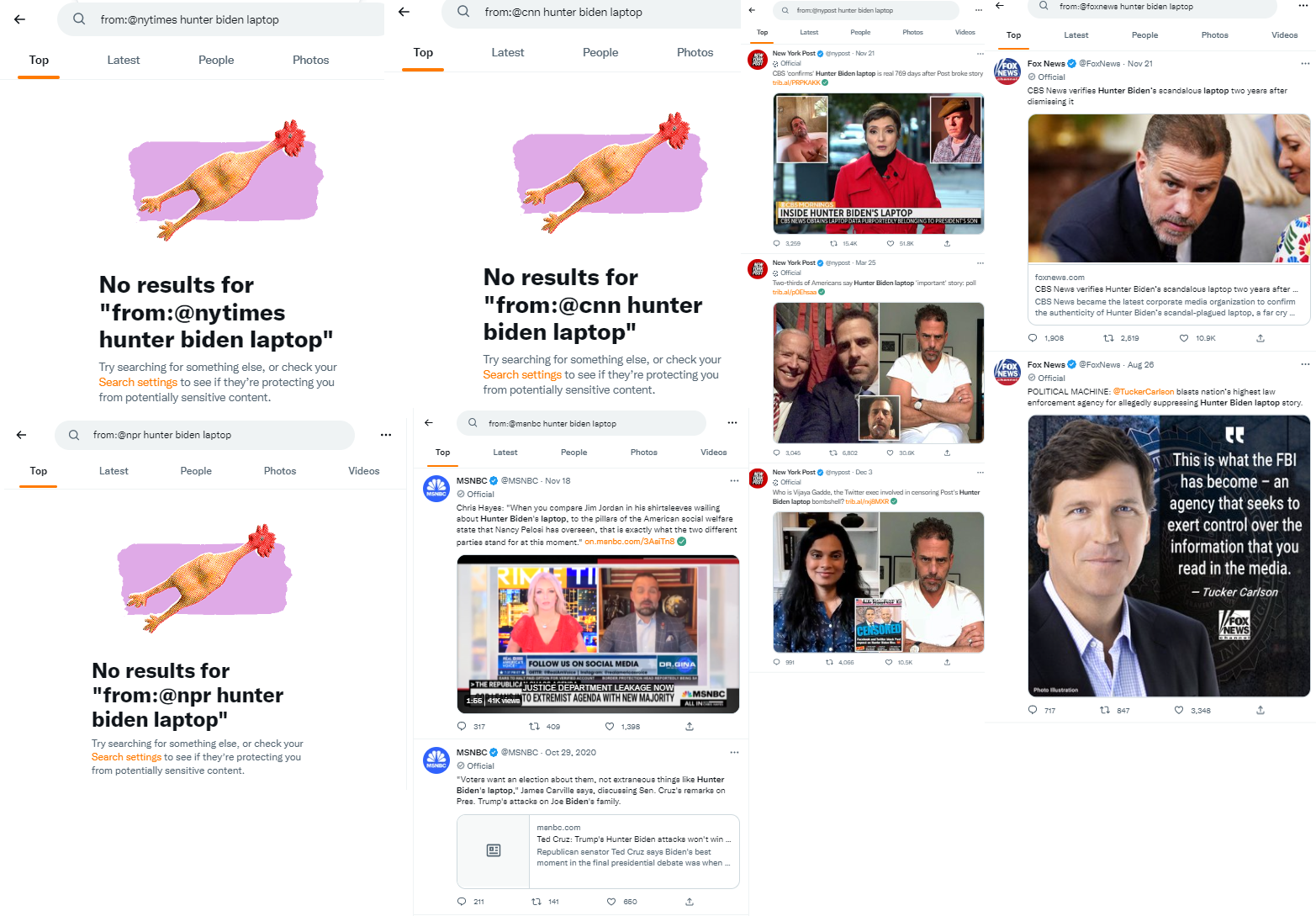As you can see, there is nothing to show from New York Times, NPR, and CNN on Twitter regarding anything related to Hunter Biden's Laptop search. MSNBC has two items (full search!) on it and even those are mocking the story. For New York Post and Fox News, I have shared only two posts, but they keep running down the page.