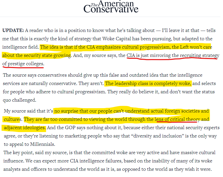 There is an interesting argument shared by Rod Dreher, the senior editor at "The American Conservative" relative to the Woke takeover of the intelligence agencies.